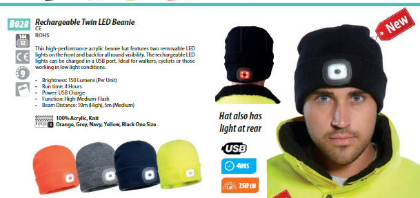 This high-performance acrylic beanie hat features two removable LED lights on the front and back for all round visibility. The rechargeable LED lights can be charged in a USB port. Ideal for walkers, cyclists or those working in low light conditions. • Brightness: 150 Lumens (Per Unit) • Run time: 4 Hours • Power: USB Charge • Function: High-Medium-Flash • Beam Distance: 10m (High), 5m (Medium) 100% Acrylic, Knit Orange , Grey , Navy , Yellow , Black One Size